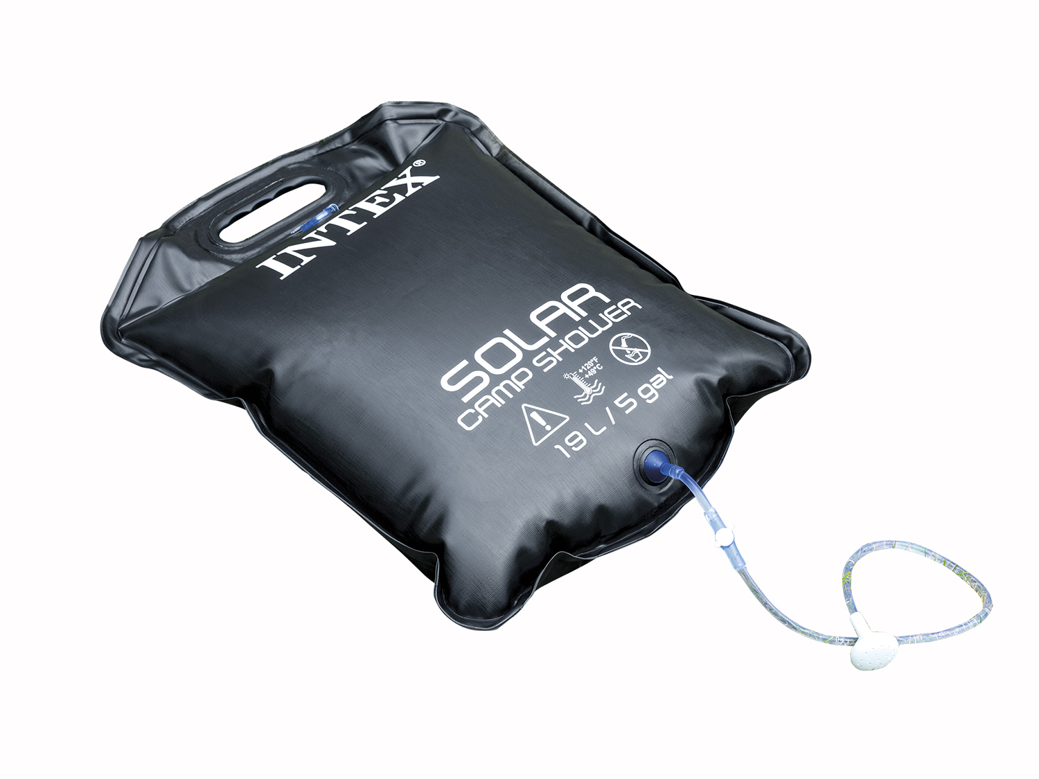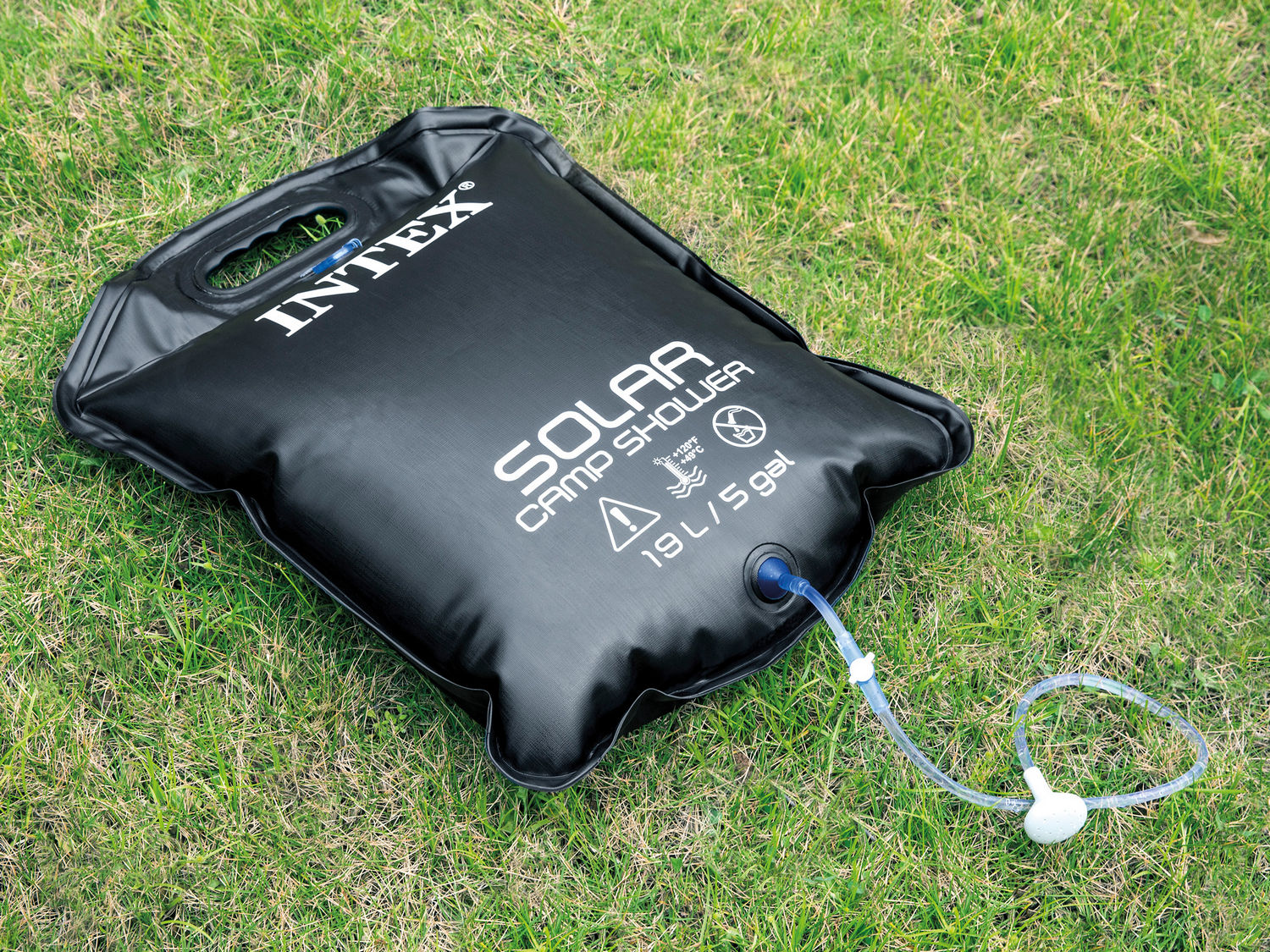Solarny prysznic campingowy o pojemności 19 litrów to gwarancja komfortu podczas pobytu na działce, campingu oraz wycieczki. Pozwoli Ci zachować higienę i poczuć się rześko po całym dniu. Jest bardzo łatwy w obsłudze – wystarczy zawiesić go na wbudowanym haku. Kontrolę przepływu wody ułatwi Ci przycisk ON/OFF. Prysznic solarny Intex podgrzewa wodę do 48 stopni. Dzięki temu możesz cieszyć się nie tylko czystą, ale i ciepłą wodą podczas kąpieli.